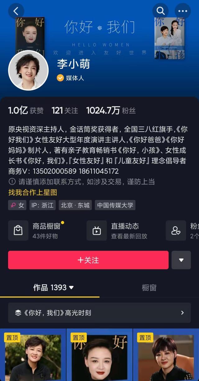 目前,李小萌在抖音平台有1024.7万粉丝,发布作品1393个。她的橱窗中有43件好物,超过225.5万粉丝在跟她买,推荐的宝贝已售10万+件。