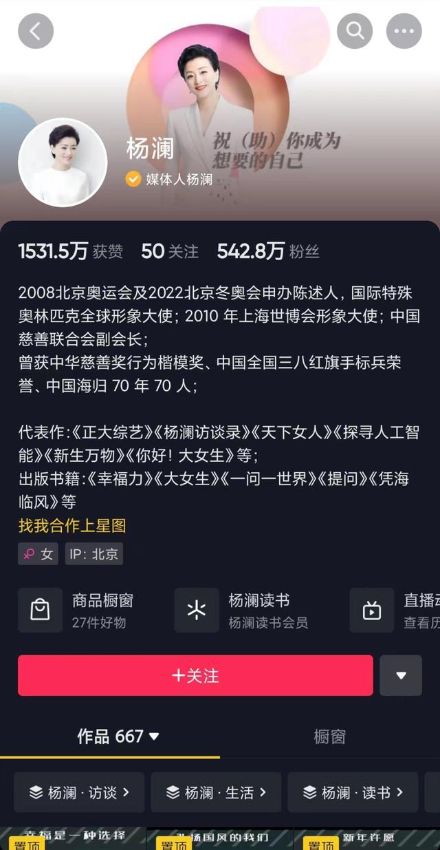 杨澜1990年至1994年担任中央电视台《正大综艺》节目主持人,并于1994年获中国第一届主持人“金话筒奖”。之后离开央视,先后主持过《杨澜访谈录》《天下女人》等知名节目。目前,杨澜在抖音上有542.8万粉丝,发布了667个作品。她的短视频作品主要分为“杨澜·访谈”“杨澜·生活”“杨澜·读书”等几大类,继续做访谈类视频,或是推荐书籍。