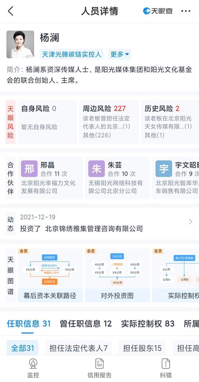 天眼查信息显示,杨澜目前在31家公司有任职信息,担任法定代表人公司7家。拥有实际控制权的公司有83家。