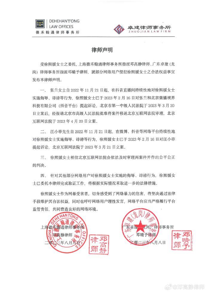 声明中称张兰、汪小菲自2022年11月21日起,在网络平台持续性地对徐熙媛女士实施侮辱、诽谤等行为。对此徐熙媛已经提起诉讼,北京互联网法院已立案。
