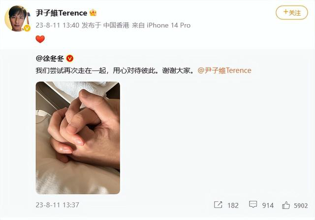 随后,尹子维火速转发徐冬冬的官宣微博,配上爱心表情。