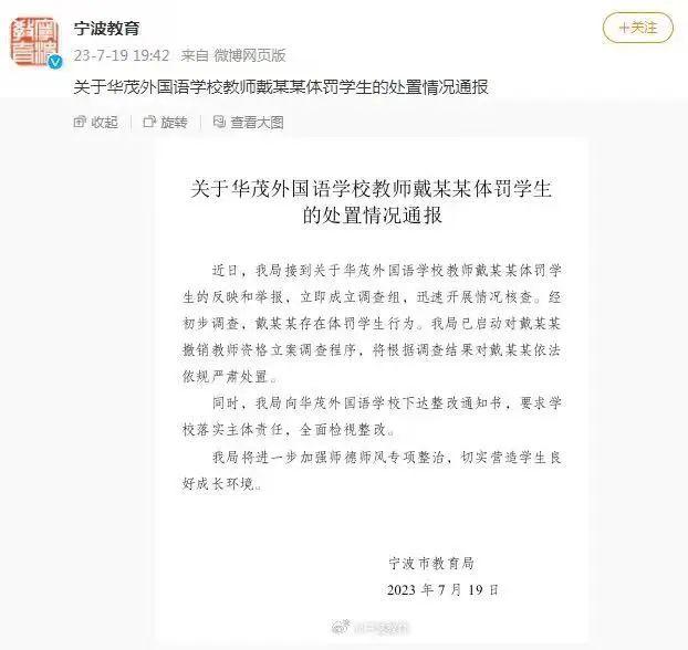 7月19日晚,宁波市教育局发布“关于华茂外国语学校教师戴某某体罚学生的处置情况通报”,称该教师存在体罚学生行为,已启动撤销教师资格证立案调查。