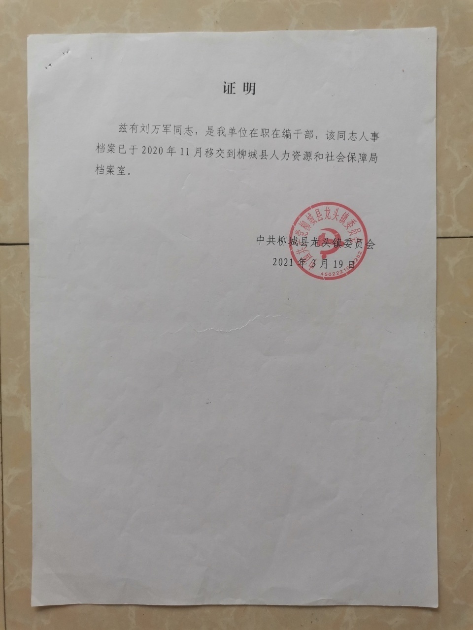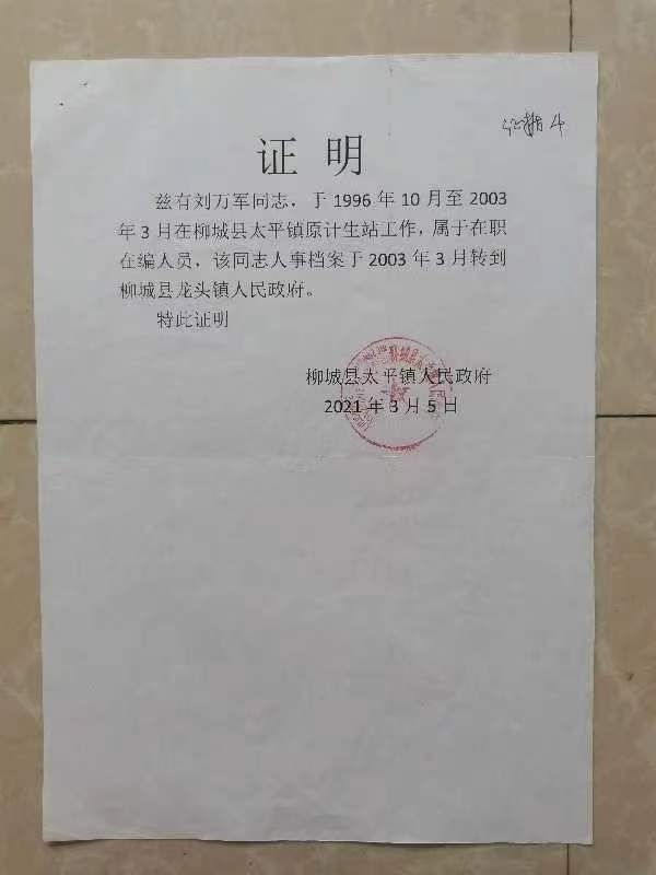 柳城县太平镇和龙头镇都曾出具《证明》,指出刘万军属“在职在编人员”。图/刘万军提供