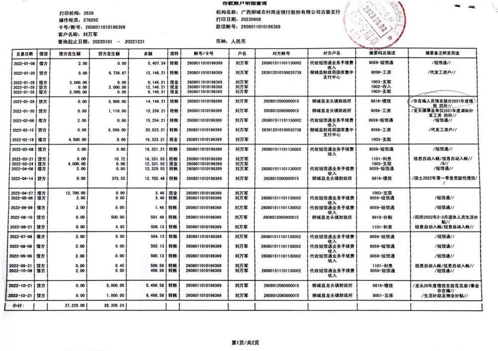 刘万军的银行流水上注明了“非在编人员”。图/刘万军提供
