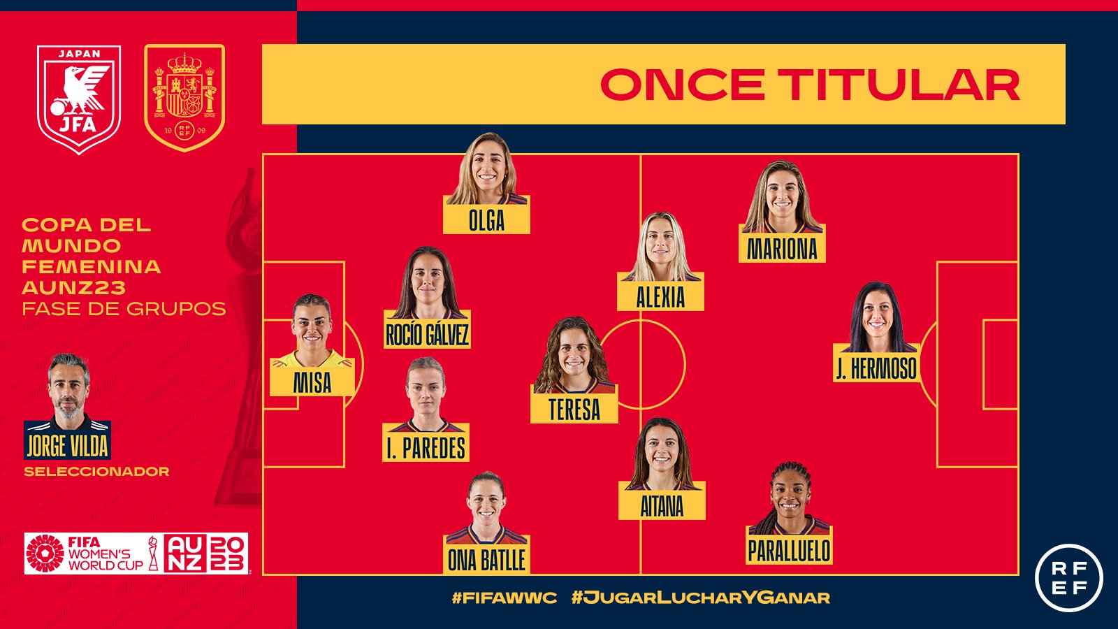 西班牙首发:1-米莎-伊莎贝尔-罗德里格斯、2-奥纳-巴特列、4-伊雷妮-帕雷德斯、19-奥尔加-卡蒙娜、20-罗西奥-加尔韦斯、3-特蕾莎-阿韦列拉、6-艾塔纳-邦马蒂、11-亚历克西娅-普特拉斯、8-马里奥娜-卡尔登泰、10-珍妮弗-埃尔莫索、18-萨尔玛-帕拉尔卢埃洛