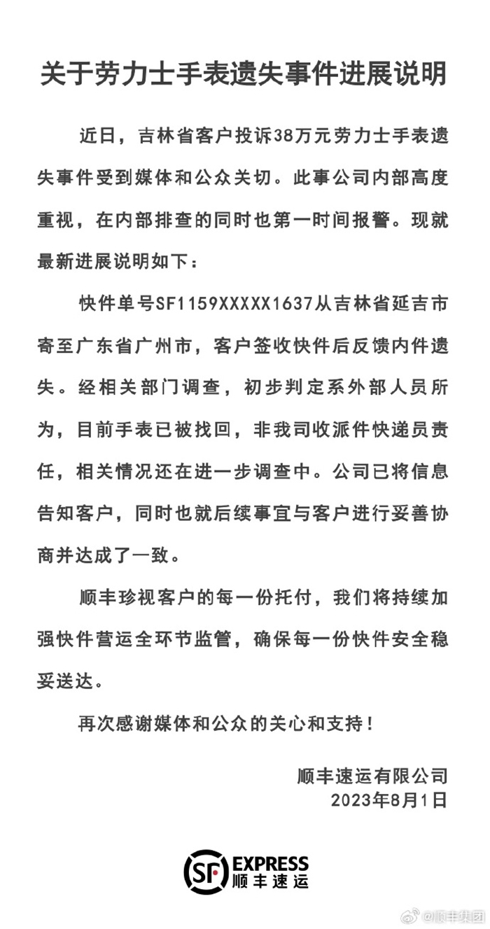 吉林省客户投诉使用顺丰快递价值38万元劳力士手表遗失事件最新进展来了,据顺丰集团1日称,目前手表已被找回,非顺丰收派件快递员责任。