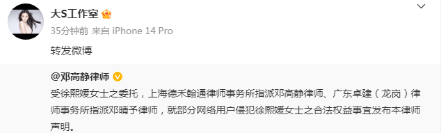 而针对其他部分网络用户对徐熙媛女士实施的侮辱、诽谤行为,徐熙媛已委托律师完成取证工作,将根据实际情况采取进一步的法律措施。