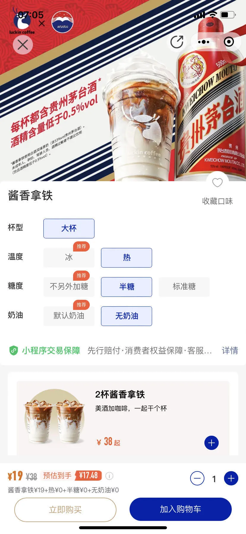 瑞幸咖啡小程序显示,酱香拿铁使用白酒风味厚奶,含53度贵州茅台酒,酒精度低于0.5%。零售价38元/杯,使用优惠券后预计19元/杯。