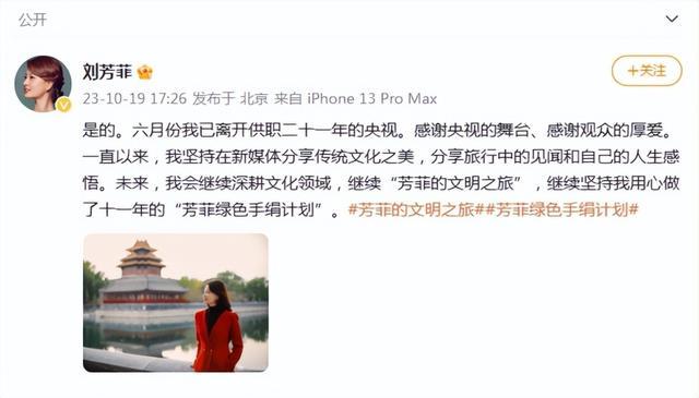 10月19日,刘芳菲发文宣布自己已于六月份离开供职二十一年的央视,并表示,未来会继续深耕文化领域,继续“芳菲的文明之旅”,继续坚持用心做了十一年的“芳菲绿色手绢计划”。